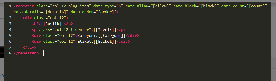 Önceki - Sonraki Yazı Kullanımı1. Alan nesnesi oluşturun2. içine 2 tane alan nesnesi oluşturun (1/2)3. Bunların içlerine biren buton oluşturun.4. Önceki Butonu içinMetin: [Kod-Amp-Onceki-Baslik]Hizalama: Solİkon: fa fa-chevron-leftİkon Hizalama: SolUrl: [Kod-Amp-Onceki-Url]Class: [Kod-Amp-Onceki] before-page5. Sonraki Butonu İçinMetin: [Kod-Amp-Sonraki-Baslik]Hizalama: Sağİkon: fa fa-chevron-leftİkon Hizalama: SolUrl: [Kod-Amp-Sonraki-Url]Class: [Kod-Amp-Sonraki] after-page